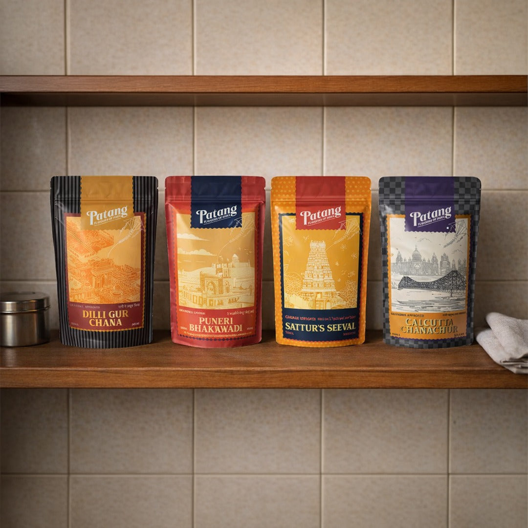 India in Four Bites is a journey across the country’s most loved street snacks, brought together in one thoughtful box. You will get four flavours in this bundle, each representing a different corner of India. From the sharp crunch of Calcutta Chanachur in the East to the jaggery warmth of Dilli Gur Chana in the North, from the bold spice of Puneri Bhakadwadi in the West to the comforting savoury notes of Sattur’s Seeval from the South.
